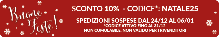 I prezzi esposti sul sito internet sono comprensivi di Iva e di ogni altra imposta; i costi del trasporto verranno conteggiati a parte, in base al tipo di spedizione che potrà essere effettuata solo con corriere tracciato. Le spese di spedizione saranno sempre conteggiate nel carrello in base all’indirizzo di destinazione. Non verranno richieste spese aggiuntive dopo il termine di pagamento dell’ordine, ad eccezione delle spese doganali che verranno chieste per gli ordini al di fuori dell’unione europea. Le spese doganali verranno calcolate dalla dogana del paese dell’acquirente e saranno pagate alla dogana stessa.